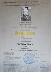 Радуют и мои ученики своими победами в международных, всероссийских, областных, муниципальных конкурсах. Самую высокую награду - Гран-при на областном рейтинговом конкурсе им. Аристова получил Москаев Иван. В этом конкурсе наши ученики ежегодно принимают участие и становятся лауреатами и дипломантами.