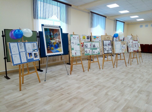 В фойе была подготовлена выставка работ выпускников отделения изобразительного искусства и оформлена фотозона, соответствующая тематике вечера.
