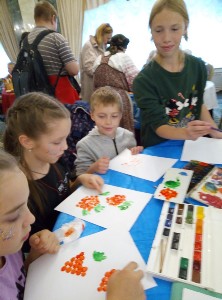 Пока выполнялись конкурсные работы, для участников и гостей были организованны интерактивные выставочные экспозиции мастеров Челябинской области и творческие мастер-классы. Была представлена экспозиция петриковской росписи, где Тамара Кудиш давала мастер-класс. Желающих услышать об этой росписи, самим приобщиться к ней, порисовать было очень много. Мастер-класс продолжился и на следующий день.