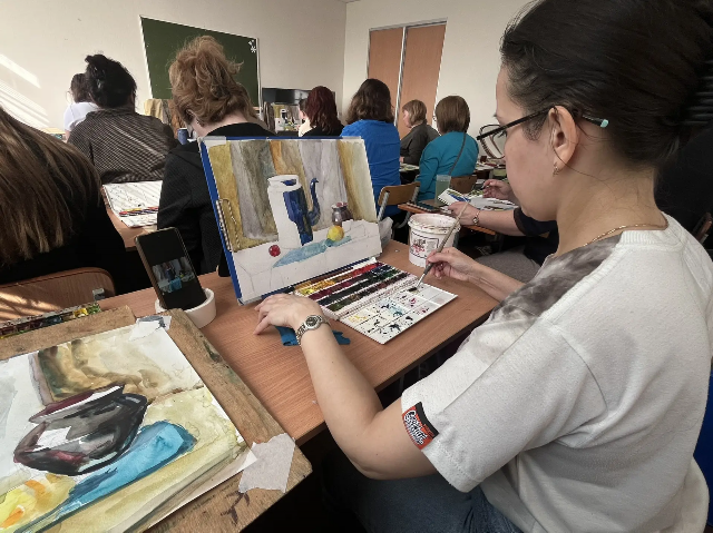 На лекции Надежды Ивановны рассматривался анализ композиции произведения изобразительного искусства, а также методика постановки натюрморта по живописи. На практической части преподавателям было предложено составить собственную композицию на основе увиденных отдельных предметов. А Елена Владимировна провела мастер-класс по методике ведения натюрморта по живописи.